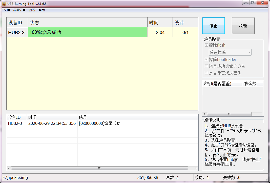 拆机,将玩客云主板取出,用USB公对公线,一头连接在玩客云2号USB口,一头连接在电脑上,玩客云暂时不要通电.电脑上安装好USB_Burning_Tool,运行软件,导入烧录包update.img 勾选上”擦除flash””擦除bootloader”,点击”开始”.