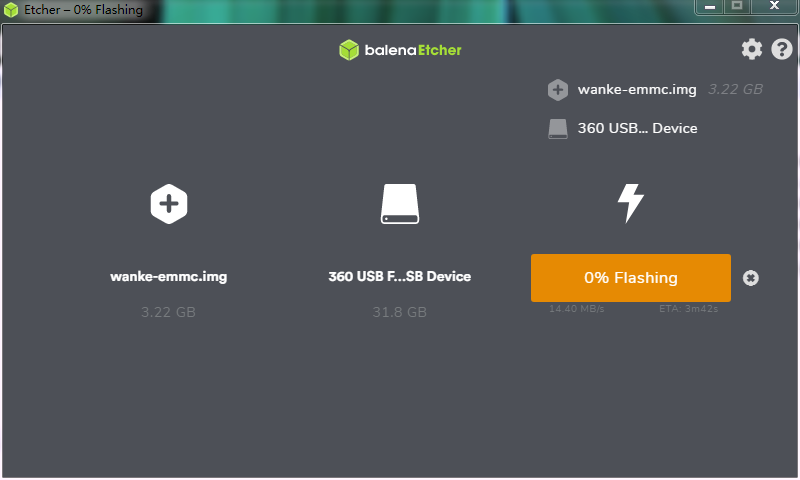 运行balenaEtcher,将解压后的wanke-emmc.img,写入优盘.写入完成后,不要着急拔下来.