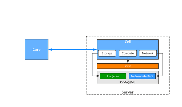 Cell模块运行在每个可以部署云主机实例的服务器节点上,Cell模块基于KVM与Libvirt工作,启动后持续采集节点资源状况,并实时同步到Core模块,另一方面,收到Core发来的实例创建指令时,分配相应的网络、存储和计算资源,并组装成云主机实例供用户使用。