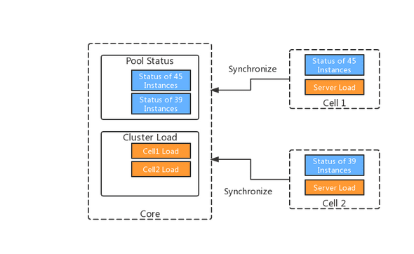 当Cell处于运行状态时,如果收到Core发来的创建实例请求,Cell生成了本地实例之后,会构建本地内存数据记录该实例状态,同时使用消息将实例信息告知Core,由Core模块在自己内存中构造一份相同的状态数据,最后Cell模块再将该实例配置写入本地配置文件中。此后,Cell会持续检测该实例运行状态,并将变更信息通知Core模块进行同步。由于Core模块拥有一个可靠的准实时状态,所以很多逻辑处理和判断在Core模块即可处理完成,无需再分发到Cell节点执行。