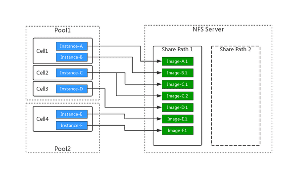 存储池将专用存储设备,比如NFS服务器或者FC SAN封装为逻辑存储空间,当创建云主机时,Core模块首先在存储池中分配指定大小的磁盘卷,然后作为存储设备远程挂载到Cell生成的实例上。使用存储池的情况下,由于云主机的磁盘数据保存在存储后端,当承载的Cell节点故障时,系统可以自动在其他Cell节点重新恢复云主机实例。存储池同样可以用于将实例在节点之间迁移,用于分担和调整节点负载以提升集群整体性能和使用寿命。