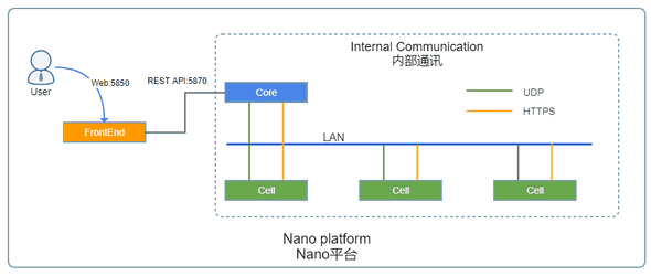 外部通讯是Nano集群与外部模块之间的通讯,通常使用固定地址和端口,以便外部访问,比如Core模块提供的REST API服务默认使用TCP 5870,FrontEnd提供的Web门户默认端口为TCP 5850。
