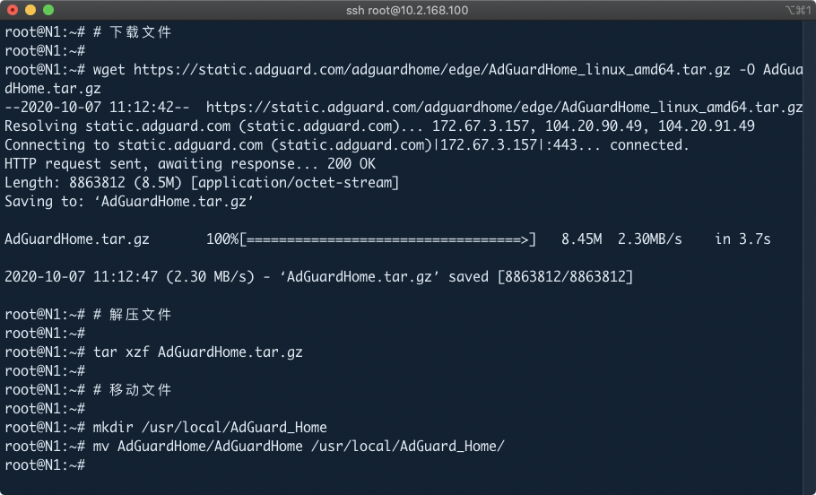 wget https://static.adguard.com/adguardhome/edge/AdGuardHome_linux_armv6.tar.gz -O AdGuardHome.tar.gz为了方便管理,我们将二进制文件移动到 /usr/local/AdGuard_Home/ 文件夹中。