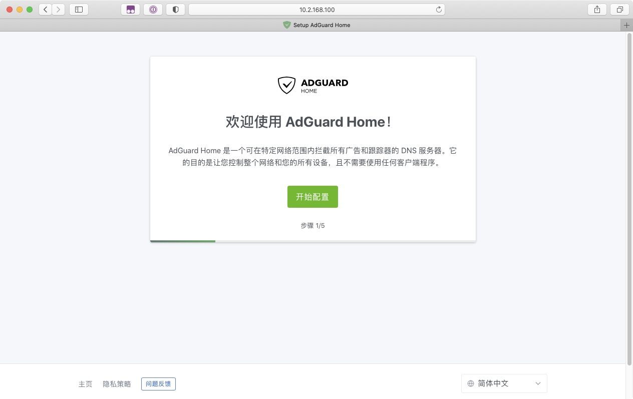 在浏览器中打开 AdGuard Home 的后台,进入安装向导,点击 “开始配置”。默认后台地址为:http://IP:3000/