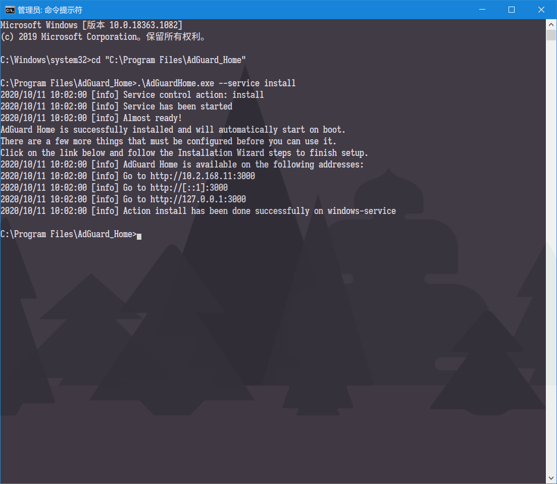 当提示 AdGuard Home is successfully installed and will automatically start on boot. 即表示 AdGuard Home 在当前系统上安装成功。在命令行中会显示管理后台的地址与端口,默认为 http://IP:3000。