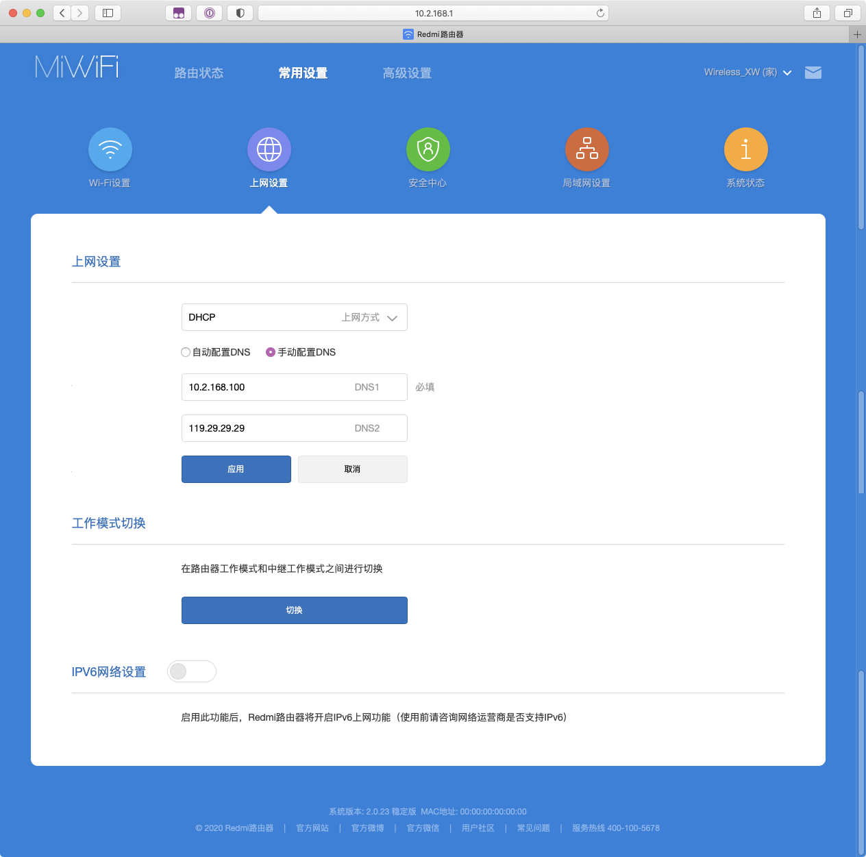 不同品牌路由器修改的方法各有差异,具体步骤可参照说明书或网上的教程(路由器型号 + 更改 DNS),下方以 Redmi AC2100 路由器为例。