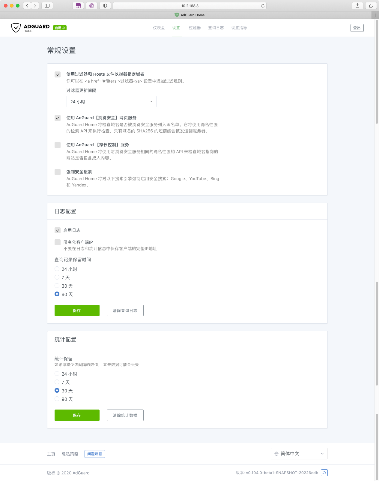 - 查询记录保留时间:AdGuard Home 服务端采用 Sqlite 文件数据库存储日志,长时间保留可能会降低运行速度,同时占用大量的储存空间,家庭用户一般保留 24 小时 - 7 天即可