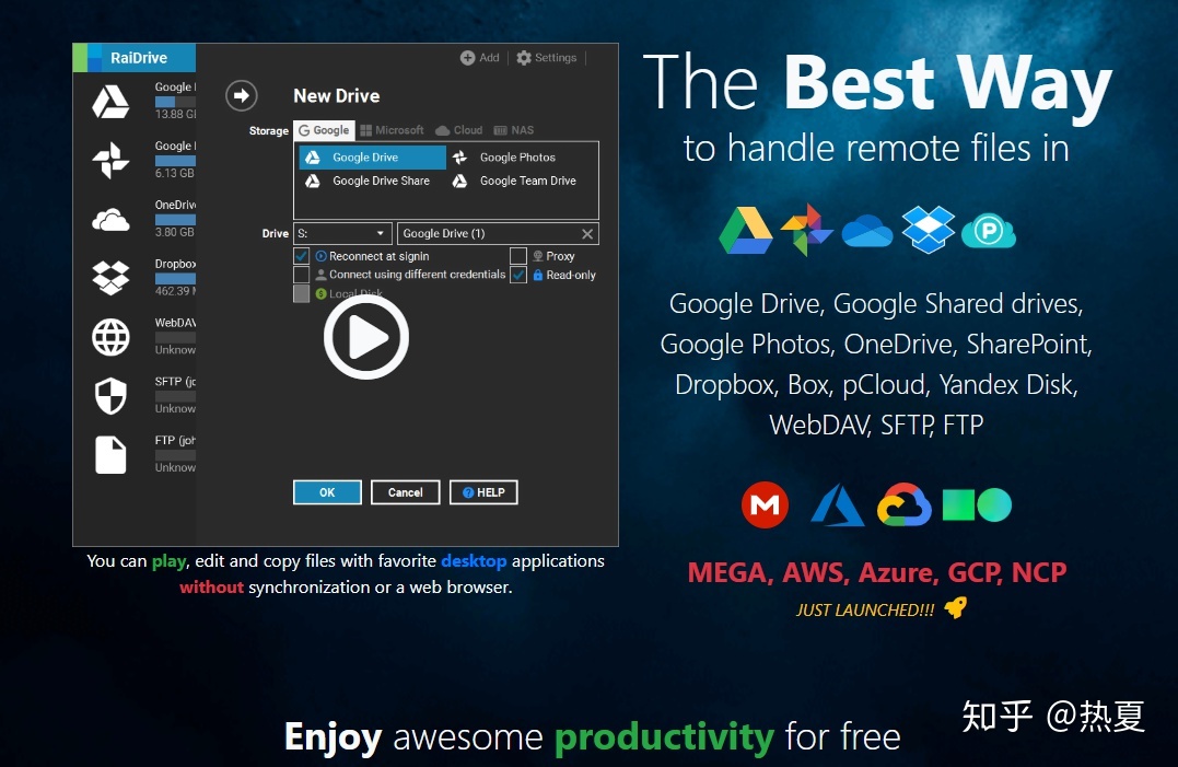 如果你觉得rclone 太麻烦,还可以试试 RaiDrive 挂载,安装后选择相应的网盘登录即可,但我用起来感觉比较卡顿。 不推荐了,2020年3月份收到邮件说挂载 Onedrive 、Google Derive 要收费了,无奈