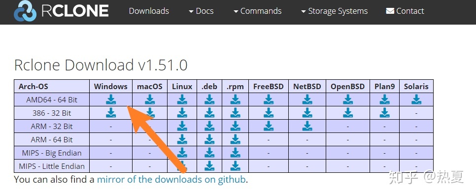 在rclone官网中,Windows 平台下选择下载 AMD64 - 64 Bit