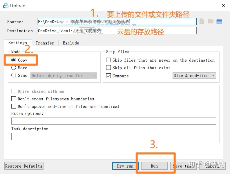 上传的话,选择要上传的文件或文件夹以及云盘的存放路径,再选择 copy 模式,点击 run 即可。下载与之类似。