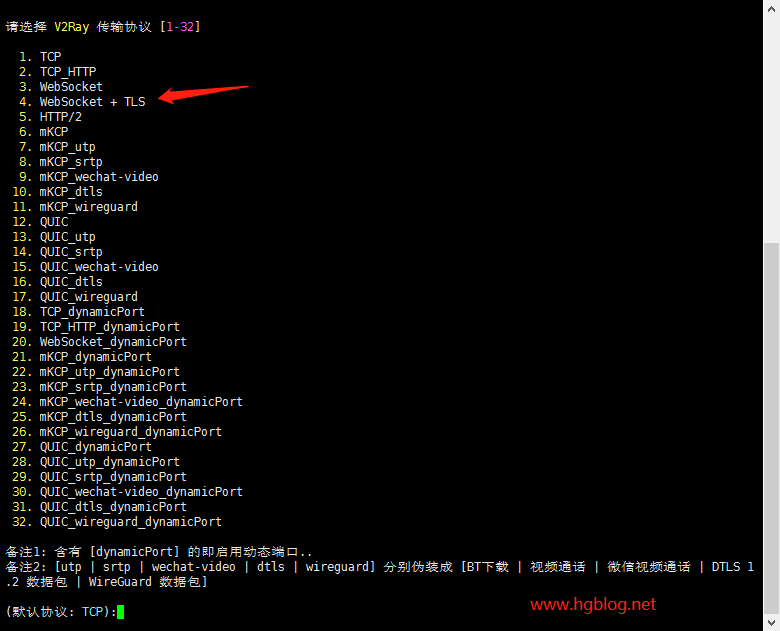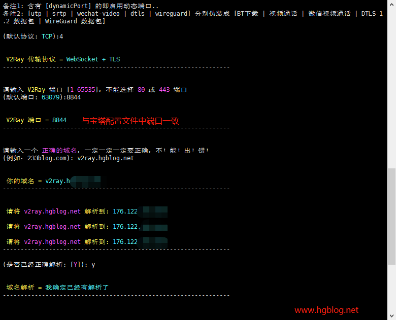 根据提示安装,选择 WebSocket + TLS,自定义端口号,与宝塔面板配置文件中的端口号一致