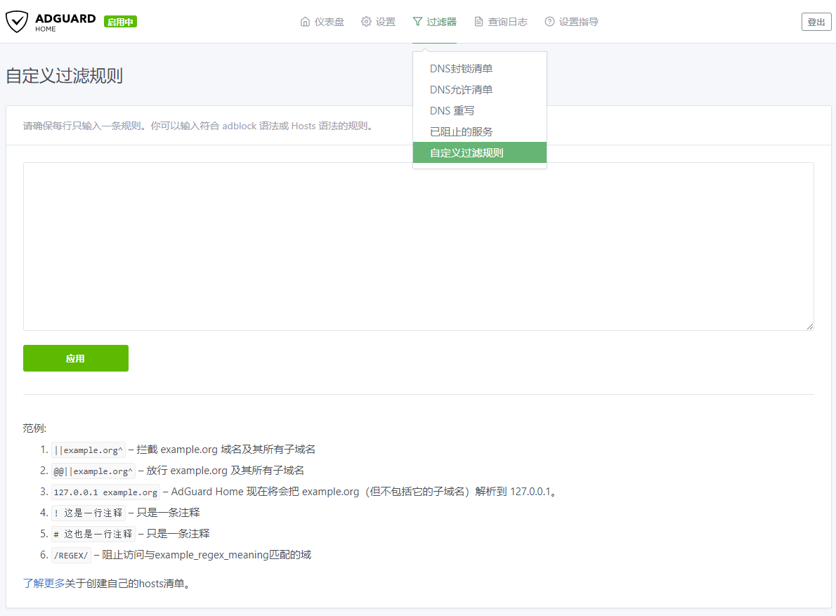 在这里你可以自定义符合 adblock 语法或 Hosts 语法的规则,以及检查过滤域名是否被过滤。具体如何使用可以参考页面上的示例和官方文档。