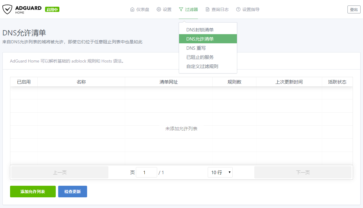 吐槽:封锁清单这个词严重怀疑是机翻,而下面的绿色按钮是添加阻止列表。博主在查看 AdGuard Home 的源码后发现简体中文的翻译有很多不统一的地方,然后花了几个小时帮助他们改进了大量的翻译,可能在后续的版本中就不再叫封锁清单了。