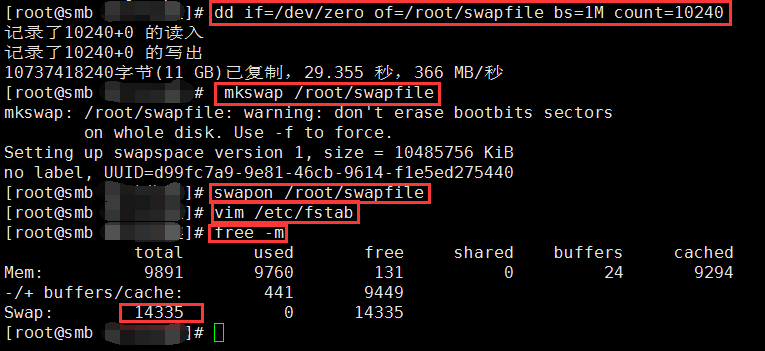 # dd if=/dev/zero of=/root/swapfile bs=1M count=10240