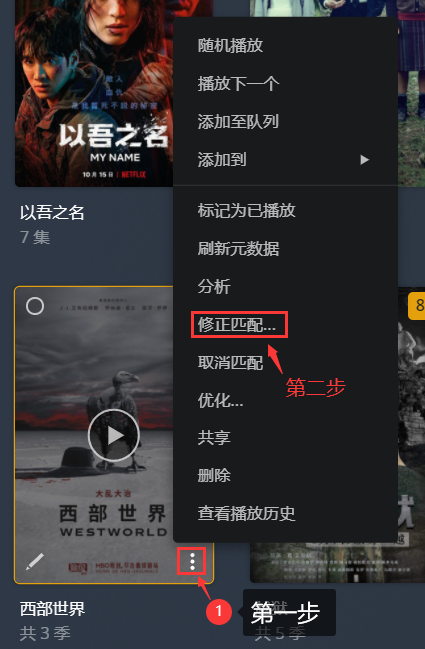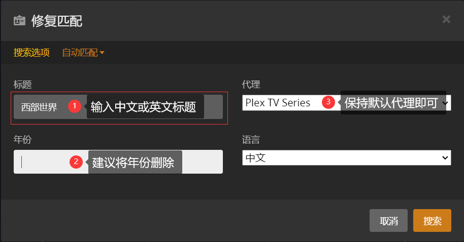 刮削器建议使用默认的plex tv即可,刮削的不对就用“修正匹配”功能手动刮削一下,参考下图: