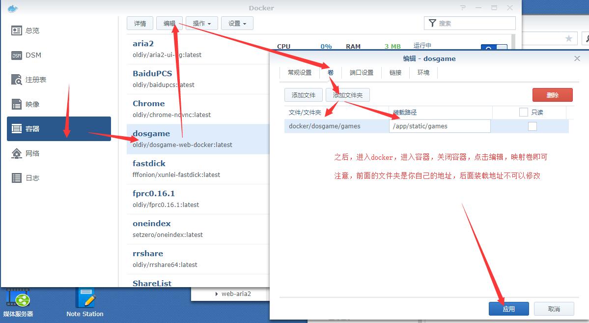 打开群晖docker,容器关闭,然后编辑,映射一个目录,如下图