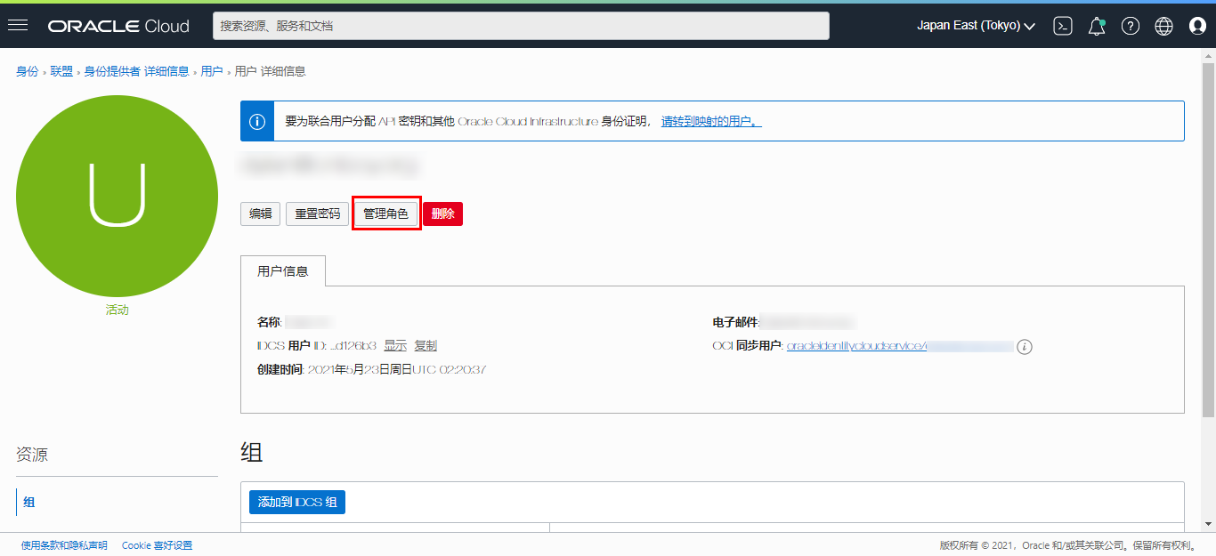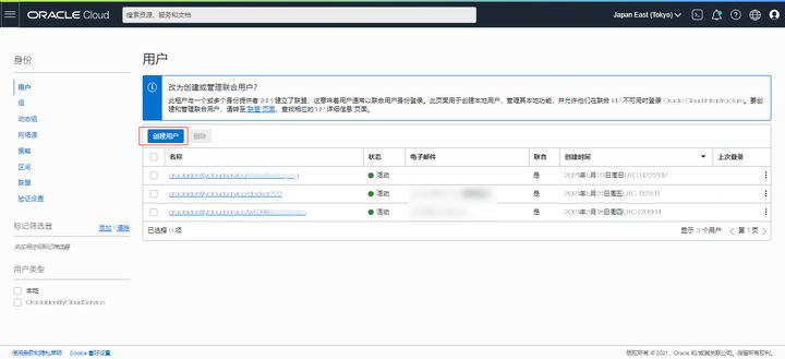 2、进入 管理控制台 后,选择 User/ 用户 栏右上角带加号的人像,即:添加用户,添加你自己的邮箱账户,给你添加的账户授予管理组的权限。建议全部选择,也可以只选择:OCI_Administrators。(此处用户总计数正常你看到的应该是1,因为博主已经添加过1个,所以总计数变为2)