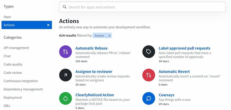 GitHub 做了一个官方市场,可以搜索到他人提交的 actions。另外,还有一个 awesome actions 的仓库,也可以找到不少 action。