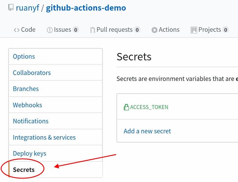 上图是储存秘密的环境变量的地方。环境变量的名字可以随便起,这里用的是ACCESS_TOKEN。如果你不用这个名字,后面脚本里的变量名也要跟着改。