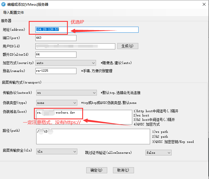 如上图修改即可,这里需要注意几个坑,很多小伙伴就在最后一步出现了错误,从而导致失败,我们这里只需要改动两处地方,第一处自然是ip,填入我们优选的ip即可,第二处需要改动伪装地址处,这里是犯错误最多的地方,这里有个格式的要求,也就是说不能填入任何HTTP或是https格式的地址,也就说只填入地址就可以了!可以参考上图!修改好点击确定,不出意外就可以正常使用了!