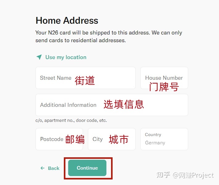 5.居住地址:目前N26只支持欧盟居民开户,所以你的居住地址一定要是你所选择的欧盟国家里一个真实地址。通过Google地图上找到外观看起来是住宅的地址,记下经纬度和地址信息,方便修改定位信息。
