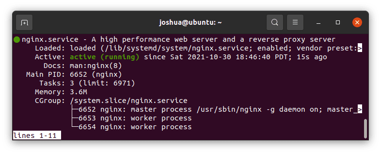 Executing: /lib/systemd/systemd-sysv-install enable nginx现在检查以确保 Nginx 已激活并且没有错误: