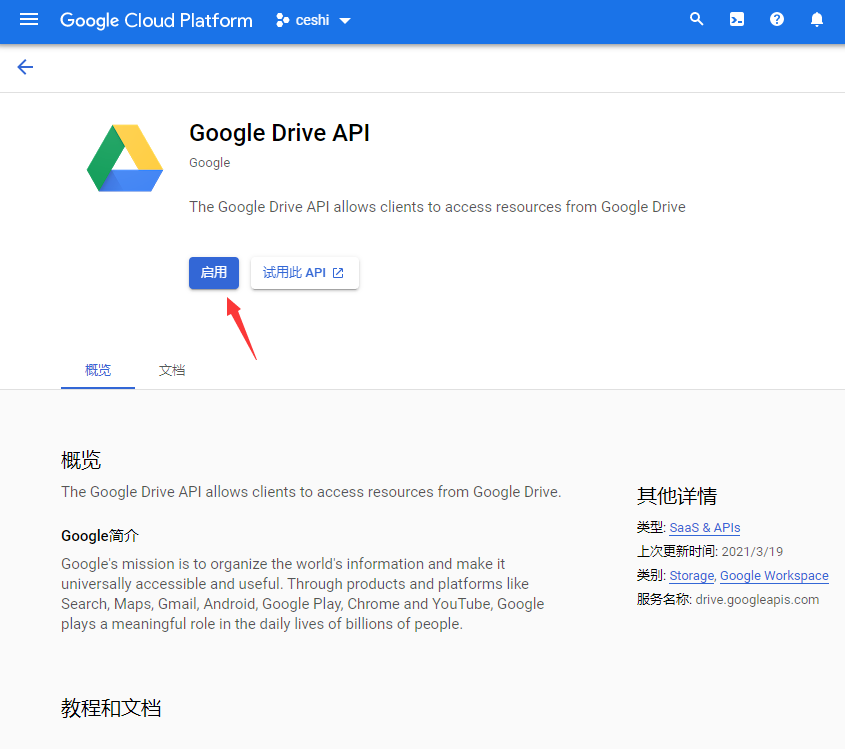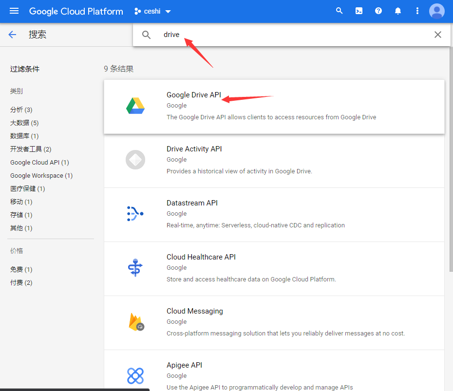 在“搜索API和服务”框内输入 drive,点击Google Drive API。