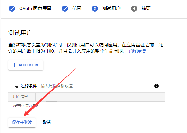 接着添加测试用户,测试用户填写自己gmail邮箱地址,