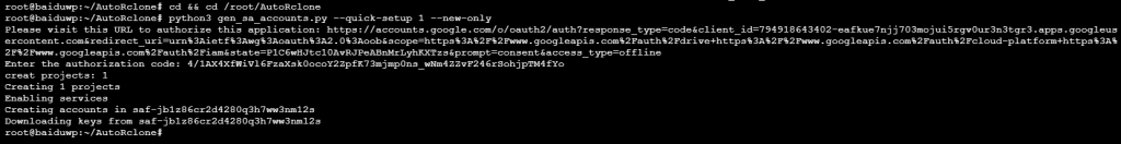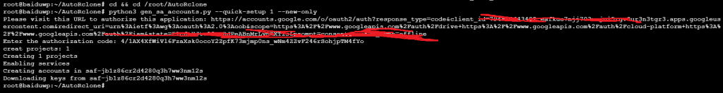 我们可以执行 ls /root/AutoRclone/accounts,发现里面有100个SA授权文件,至此SA已生成完毕。