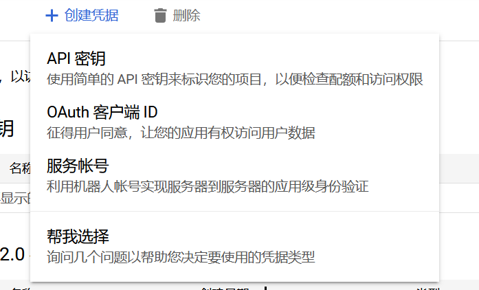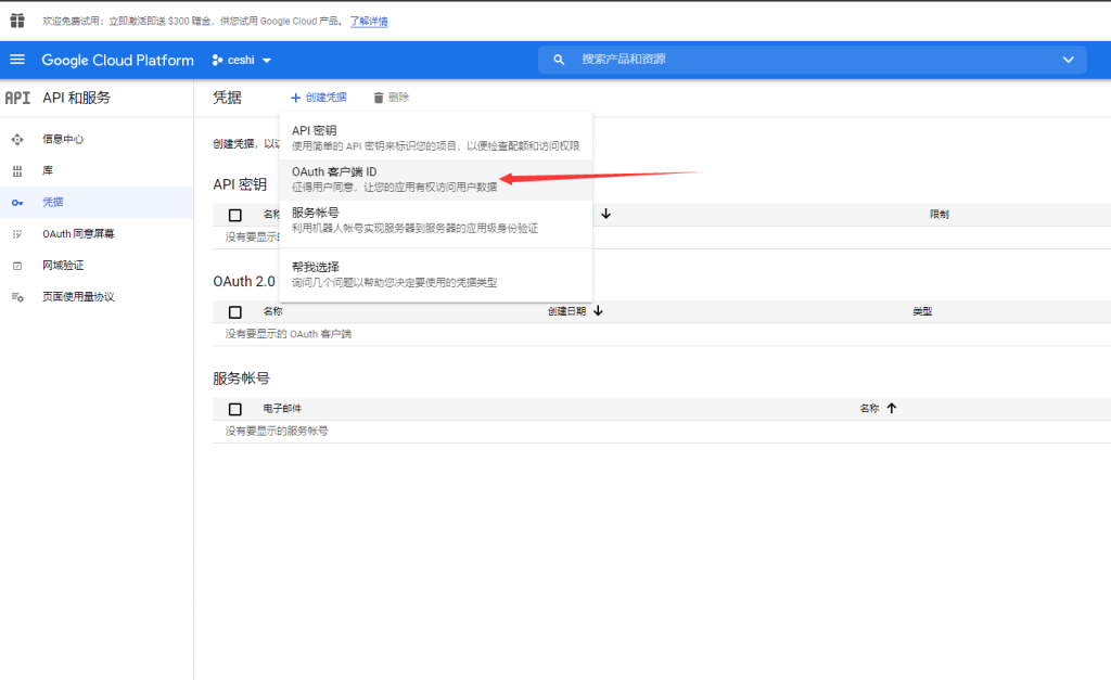 点击凭据,屏幕上方点击创建凭据,选择OAuth 客户端ID