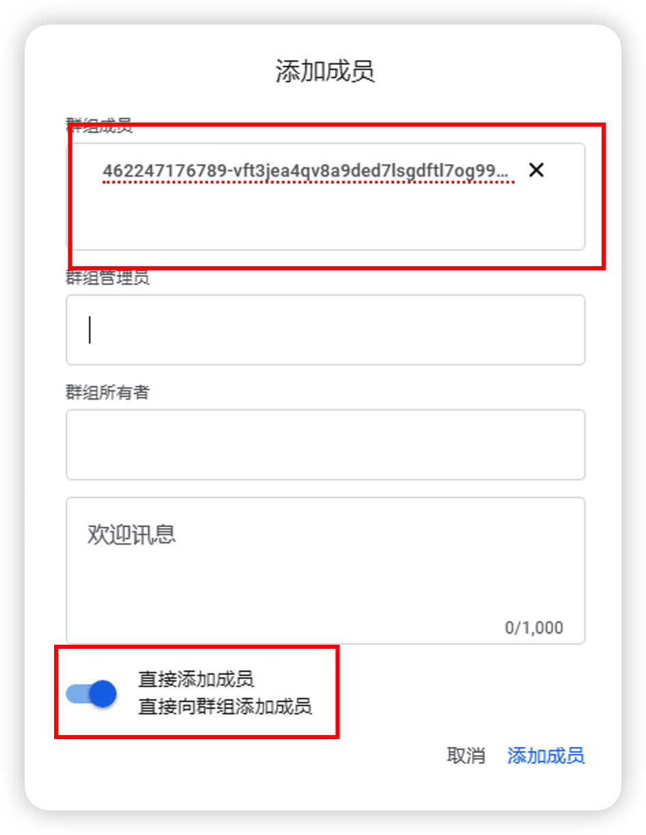 将包含 SA 的 GoogleGroup 账号添加到 GD 里