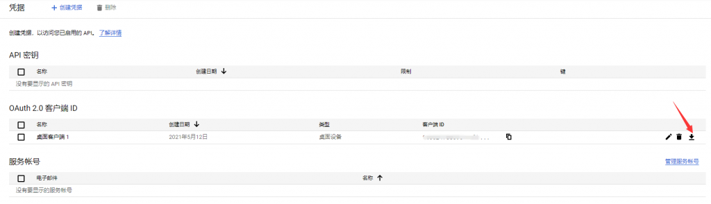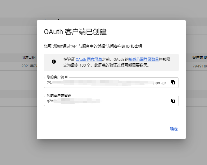 至此,OAuth同意屏幕配置完成,接下来创建客户端ID和密码,