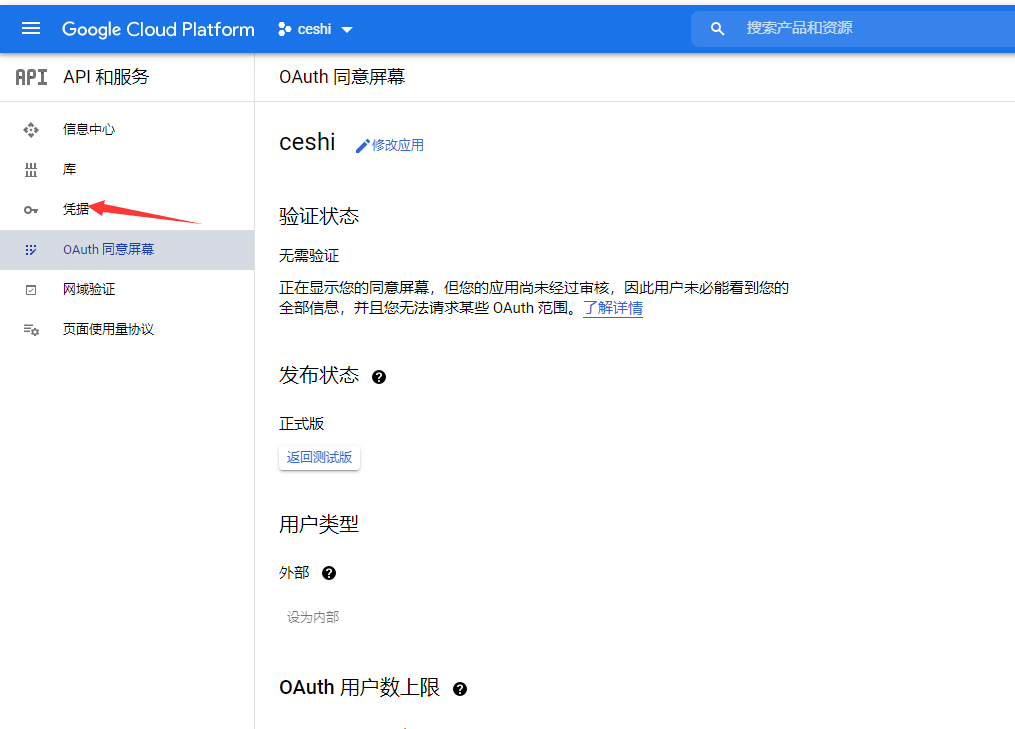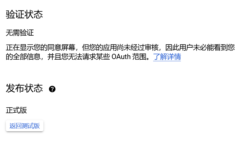 最后选择OAuth同意屏幕,选择发布应用。此时应该能看到发布状态变为了正式版。