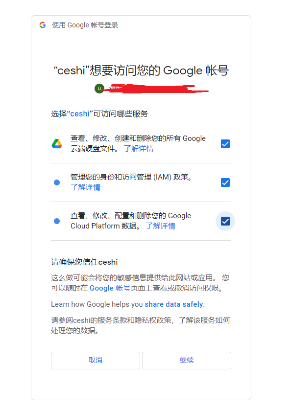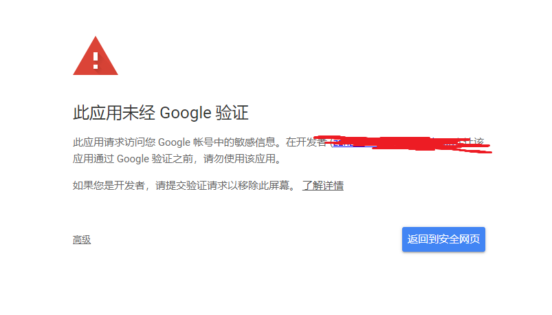 如果不出意外,会自动打开浏览器进入到谷歌账号登录界面,此时一定要登录被挂载的谷歌账号,并选择同意授权。由于是新申请的API,没有经过的谷歌的验证,所以谷歌会提醒该应用未经验证。但是左下角有一行小灰字,点击选择继续就能授权。