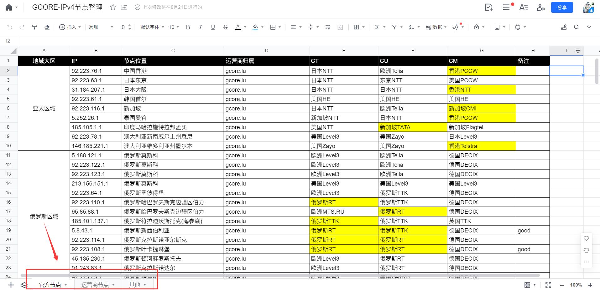 纵观CDN的市场,除了CloudFlare能如此大方且功能完备的的仅此一家了吧?以下所有测试的节点都是基于GCORE官方公布的白名单列表(点击前往),无需担心使用它们的安全性。节点比较多,不知道以什么样的形式展示比较合适,就弄了个腾讯文档。如果你有更好的意见,欢迎在评论区向我提出来~