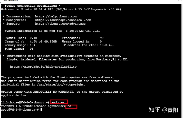 进入实例管理页面,依次点击“远程登陆”-(一键登录)“登陆”,会弹出在线webshell,输入 【sudo su】 切换为root登陆,并输出【cd】切换目录。