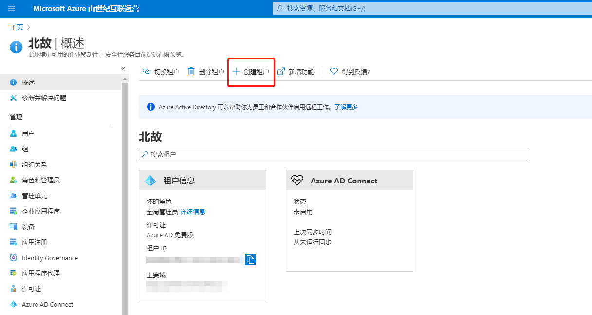 5、再次进入Azure Active Directory:https://portal.azure.cn/#blade/Microsoft_AAD_IAM/ActiveDirectoryMenuBlade/Overview